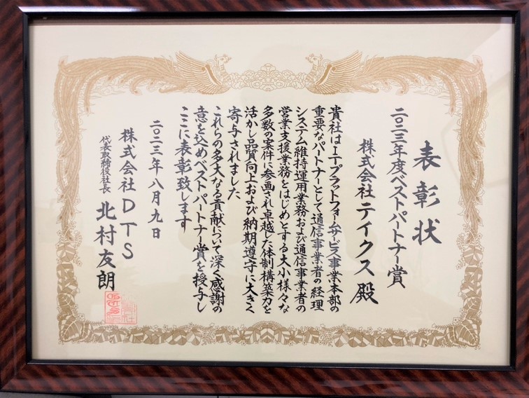 2023年8月9日、株式会社DTS様より当社の業務を評価いただき、ベストパートナー賞を賜りましたことお知らせいたします。